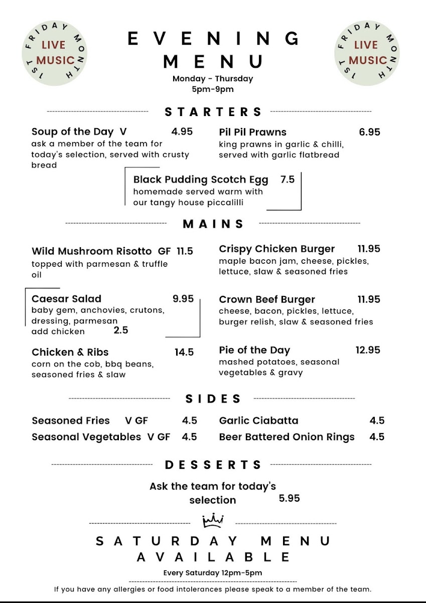 The sides are equally tempting, from Seasoned Fries to Beer Battered Onion Rings, each priced at £4.50. The atmosphere is inviting, with a lovely patio area for those sunny days. Customers rave about the warm service and refreshing beers. With glowing reviews highlighting the transformation of this venue, The Crown stands as a must-visit culinary spot. Come experience a meal that marries quality with a welcoming ambiance!